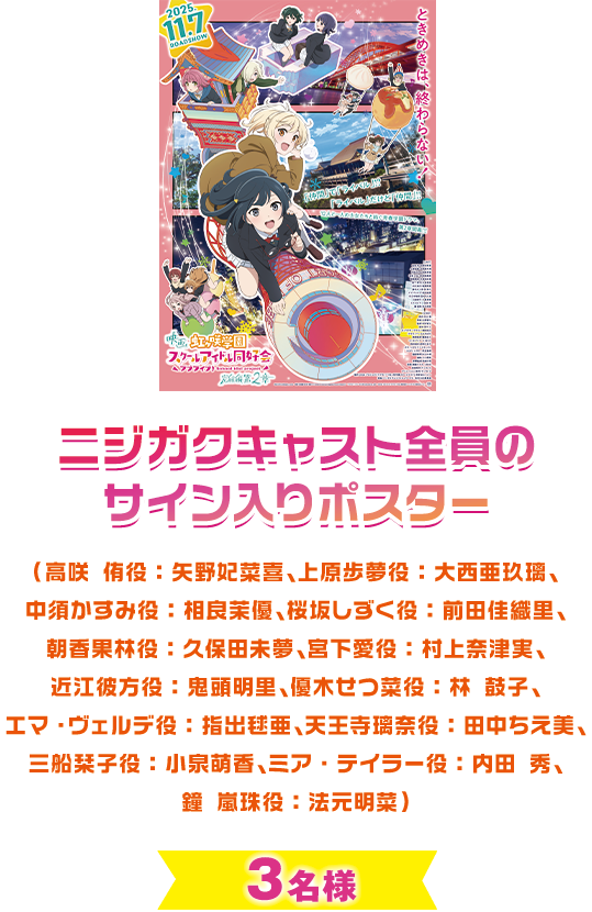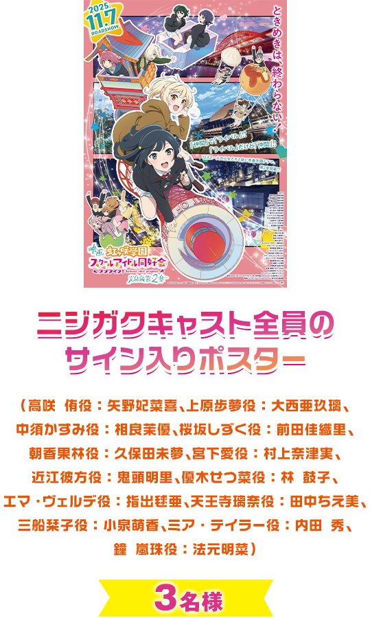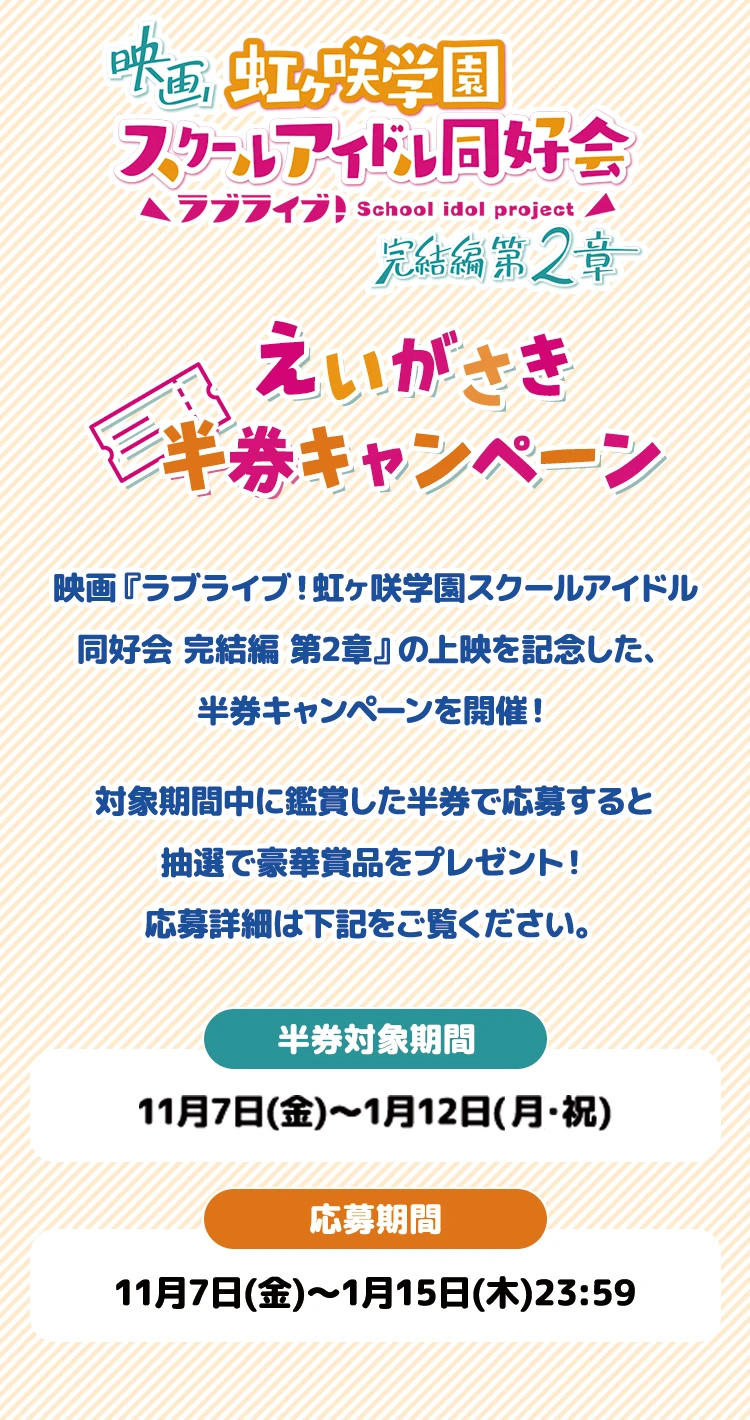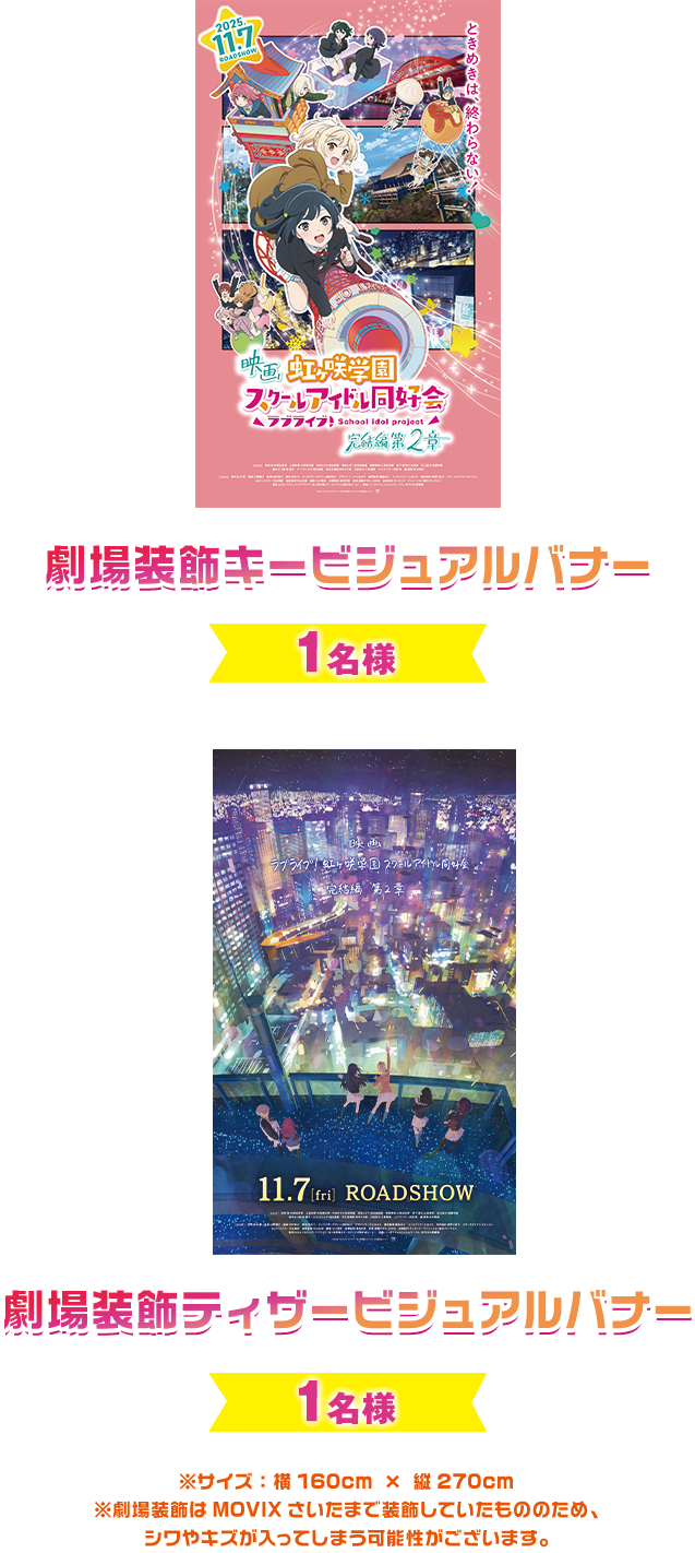 - 本キャンペーンは映画『ラブライブ!虹ヶ咲学園スクールアイドル同好会 完結編 第2章』製作委員会が主催し、キャンペーン事務局を松竹株式会社が運営いたします。